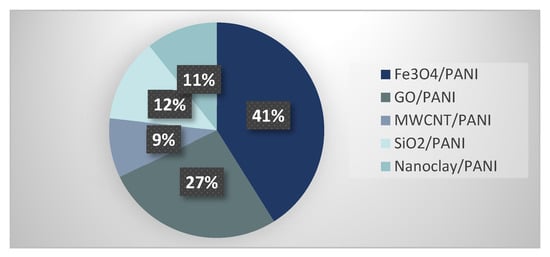 Nanocomposites based on PANI and nanomaterials have attracted much attention in the past decade for the adsorption of heavy metals. These nanocomposites display enhanced adsorption performance as compared to individual materials. These PANI nanocomposites can be divided into the following groups: PANI/metal oxides, PANI/carbonaceous nanomaterials, PANI/silica, and PANI/nanoclays. This review focuses on the physicochemical properties of the prepared materials, their adsorption capacity, and their mechanism of adsorption of heavy metals. Based on the reviewed literature, Fe3O4/PANI magnetic nanocomposites and multifunctional magnetic nanocomposites are the most used materials for the adsorption of metal ions (Figure 6).