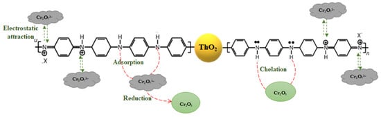 In a study conducted by Sahu et al. [52], a thorium oxide nanoparticle core-coated polyaniline nanocomposite synthesized via an in situ polymerization method was applied to remove Cr(VI). The surface of the prepared nanocomposite was uniformly coated with amorphous PANI, and each distinct ThO2 NP was coated with a PANI shell. The nanocomposite exhibited a good thermal stability, even beyond 700 °C, as well as a high specific surface area of 86.98 m2/g and low average pore diameter of 3.9 nm, with a pore distribution in the nanoscale range, which implied its highly porous nature. The adsorbent displayed a maximum adsorption capacity of 141 mg/g under the optimal conditions of pH 5, T = 323 K, and t = 60 min as equilibrium time. The mechanisms of Cr(VI) adsorption by ThO2/PANI were due to the anionic adsorption of Cr(VI) via electrostatic interaction and adsorption, coupled with the partial reduction of Cr(VI) to Cr(III) (Figure 7). Moreover, the ThO2/PANI nanocomposite showed good stability and potential reusability.