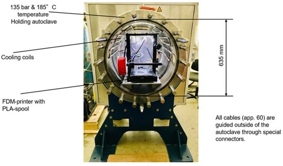 In addition, the control unit box of the 3D-printer was connected out of the autoclave using extended wires. The 3D printer was placed on a specially designed plate in the cylindrical cavity of the autoclave. An infrared night vision camera was installed inside the autoclave to record the video. Significant parts of the 3D printer did not withstand elevated pressure and temperature as it had not been made for such conditions. To evade these issues, some modifications were done to the hot end and electrical capacities of the 3D printer’s motherboard.