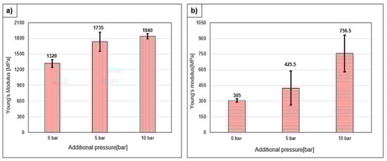 Young’s modulus comparison of samples printed in different pressure conditions (a) longitudinal and transverse (b) to the printing direction.