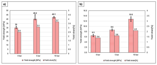 Yield strength and yield strain comparison of samples printed in different pressure conditions (a) longitudinal and (b) transverse to the printing direction.