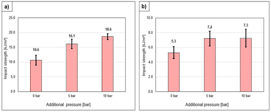 Impact strength comparison of samples printed under different pressure conditions (a) longitudinal and (b) transverse to the printing direction.