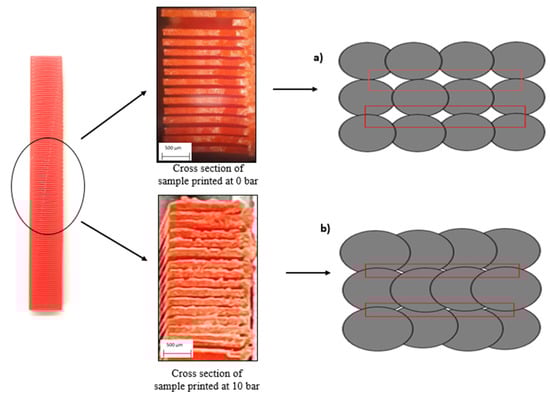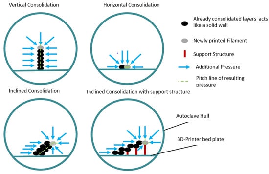 Below, Figure 10, illustrates a pictorial view of the effect of autoclave pressure while printing on the consolidation of printing layers. The pressure gradient positively affects the layer consolidation and facilitates the better compaction of polymeric material.