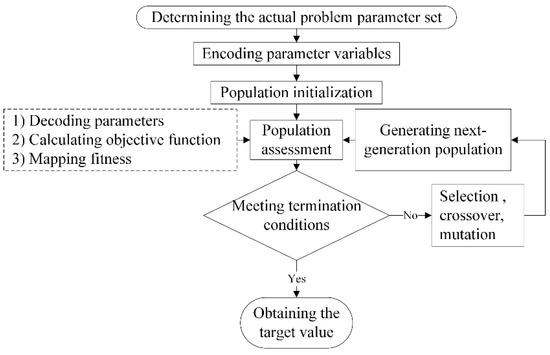 The core content of genetic algorithm mainly includes four parts, namely selection, crossover, mutation, and fitness evaluation. The optimisation process is shown in Figure 2.