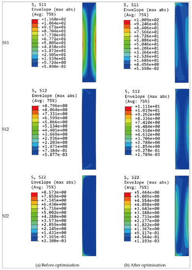 where, is the longitudinal stress, is the transverse stress, is the shear stress, is the longitudinal tensile strength, is the longitudinal compressive strength, is the transverse tensile strength, is the transverse compressive strength, S is the shear strength; are strength parameters as shown below in Equation (10).