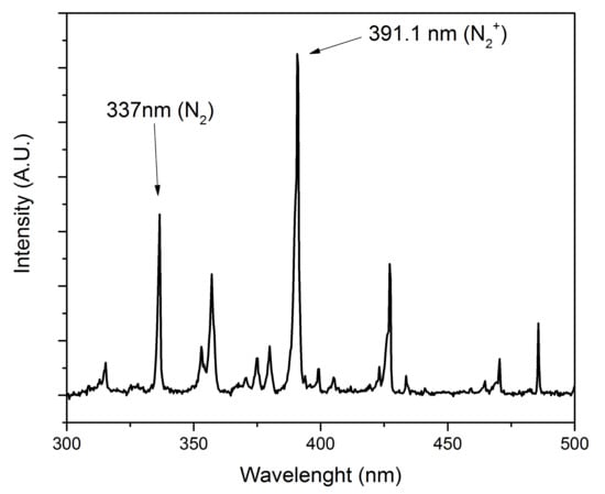 Figure 2 shows the optical emission spectral data of N2 plasma. The peaks with the highest emission intensities, located at 337 nm and 391.1 nm, are due to emission produced by radiative decay corresponding to the N2 molecule and N2+ ion emission, respectively. The electronic state population observed for N2, as well as that for the N2+ ion, is mainly due to direct excitation of N2 and N2+ from their ground state, produced by impacting electrons having energies above their excitation threshold. In the emission spectrum, the intensity of both peaks is proportional to the electron density of N2 and N2+. The obtained emission spectra are in agreement with previous studies carried out by other research groups, for instance, Qayyum et al. and Abdel-Fattah et al., who reported emission peaks similar to those found in the present work [,].