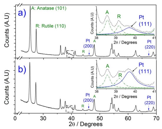 XRD analyses of the monometallic TiO2/Pt sample obtained after 1 h and 2 h (Figure 3) show that the intensity of the main peaks of anatase (101) and rutile (110) do not present significant changes after having been subjected to the nitrogen plasma. Likewise, they show that the crystallinity of P25 TiO2 does not change after the plasma treatments. This means that their composition ratio confirmed using the Spurr–Meyer’s equations remains constant in a range of 70% anatase and 30% rutile. On the other hand, the average crystalline domain size of pure P25 TiO2 was calculated from the Scherrer equation with a crystallite size of about 26 ± 3 nm, and no significant changes in crystalline size after plasma treatment were found. Furthermore, through the XRD analysis shown in Figure 3, we can see the characteristic (111), (200), and (220) diffraction peaks of platinum, which are observed at 39.7°, 46.0°, and 67.3° (2θ) values, respectively. These peaks are more intense for the samples subjected to 120 min of treatment. The insets located in Figure 3a,b show a deconvolution analysis carried out in the samples, where an additional diffraction peak was observed at 39.70° (2θ) and was indexed to the (111) plane corresponding to metallic Pt. The intensity of this peak was stronger after 2 h of plasma treatment than that obtained for 1 h, confirming that nitrogen plasma promotes the impregnation of Pt particles on the titanium oxide surface. Likewise, the intensity of (200) and (220) diffraction planes corresponding to Pt were more evident in the XRD pattern after 2 h of plasma processing.