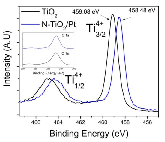 X-ray photoelectron spectroscopy (XPS) was used to analyze the chemical states of the elements in samples obtained after plasma treatments. The XPS spectra of Ti 2P are shown in Figure 4 and exhibit the characteristic Ti 2P binding energies, labeled as Ti 2P3/2 and Ti 2P1/2 doublets, which are associated with the Ti4+ valence state on oxygen lattice. A binding energy shift can be observed in N-TiO2−x/Pt sample after 2 h nitrogen plasma treatment compared to the standard TiO2; however, no shifting was observed for C 1s peak position (see inset in Figure 4). An important variation in the position of the band attributable to Ti(IV) in the Ti-O bond can be observed, when compared to the TiO2 spectrum. The shift to a lower binding energy of Ti 2P3/2 detected for N-TiO2−x/Pt can be caused by nitrogen doping, as shown in the N 1s XPS spectra (Figure 5b). This observation has been confirmed by other research groups who correlate the shift to a lower binding energy with substitutional and interstitial nitrogen atoms into the TiO2 matrix [].
