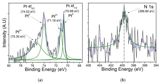 On the other hand, the characteristic signals of platinum can be seen in Figure 5a. The Pt 4f binding energies are observed at 70.68 eV (Pt 4f 7/2) and 74.03 eV (Pt 4f 5/2) and are ascribed to metallic platinum (Pt0). Moreover, it shows an additional two peaks at 71.16 eV (Pt 4f 7/2) and 75.30 eV (Pt 4f 5/2), which suggests the presence of platinum in its Pt2+ oxidation state, which means that PtO is also observed on the TiO2 surface, and in this study, PtO2 was not observed. However, in the XRD analyses (Figure 3), platinum oxide phase was not observed, and they only show metallic platinum (Pt) and titanium oxide phases; it is likely that the platinum oxide concentration is outside the equipment detection limit. These results agree with those of other studies carried out by different research groups that have applied chemical methods for incorporating platinum onto a TiO2 surface; they report the presence of metallic platinum and platinum oxide on the material [,,].