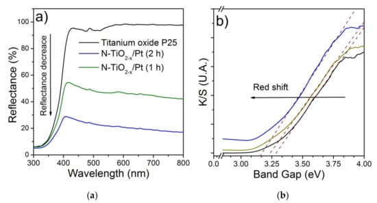 The reflectance and absorbance spectra of the metal-impregnated samples after 1 h and 2 h nitrogen of plasma treatments are presented in Figure 6. The diffuse reflectance UV–Vis spectra (DRS) for the standard (TiO2 P25) and for the plasma-treated samples are shown in Figure 6a. The K/S relation that was obtained from the DRS data was determined by applying the Kubelka–Munk equation given by the following equation: