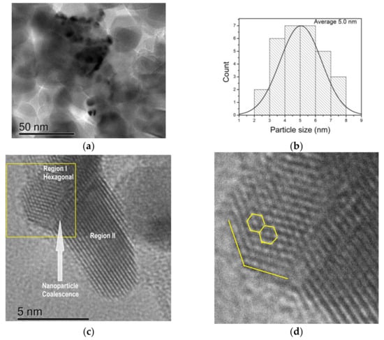 Transmission electron microscopy of platinum nanoparticles: (a,b) monodispersed platinum nanoparticles in the 2–8 nm range; (c) Pt nanoparticles in coalescence region; (d) zoom-in image of Figure 7c and the yellow square showing the boundaries.