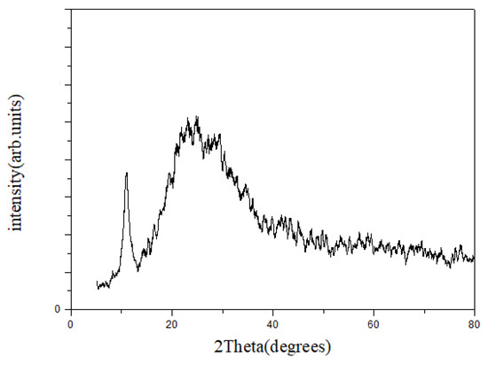 When graphite is oxidized with strong oxidants, graphene oxide can be obtained. In this study, graphene oxide maintains the hexagonal lattice structure. There are many oxygen-containing functional groups on the surface of carbon, e.g., carboxylic, hydroxyl, and epoxy groups. These oxygen-containing functional groups open up the distance between carbon and carbon layers, which reduce the 2θ angle [3]. Graphene oxide (GO), as shown in Figure 1, has a distinct characteristic peak at 2θ = 10.9° [4], and a broad diffraction peak appears at 2θ = 24.9°. This indicates a typical graphene oxide characteristic peak.