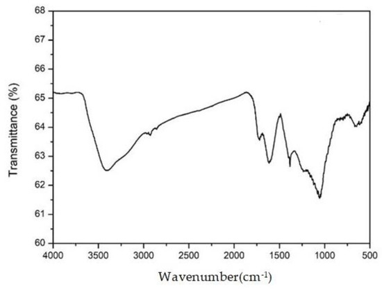 The FT-IR of graphene oxide (GO) is shown in Figure 2. The peak at 3410 cm−1 is the stretching vibration of the -OH group. The peak at 1718 cm−1 is the stretching vibration of the carboxyl group. The peak at 1614 cm−1 is the C=C group plane stretching vibration. A total of 1384 cm−1 was OH deformation, 1235 cm−1 was the stretching vibration of C-OH, and 1057 cm−1 was the stretching vibration of CO. This part of the results is consistent with that documented in the literature [5].