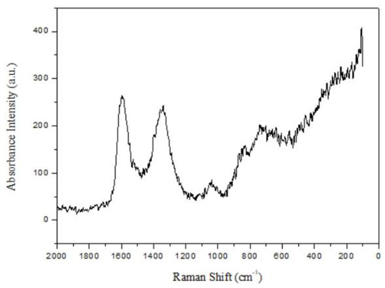 In Figure 3, graphene oxide (GO) has two strong characteristic peaks, which are the D band signal of 1357.5 cm−1 and the G band signal of 1595.9 cm−1. The D band signal is the vibration of the edge of the carbon crystalline state. Clearly, when the D band becomes strong, the surface tends to defect; the G band signal is caused by the plane vibration of the graphene oxide sp2 carbon atoms. The graphene oxide we prepared had an ID/IG of 0.83. This part of the results derived from this study is similar to that of the previous literature [6] because when ID/IG is 0.82, ID/IG is an index for judging the disorder in related defects, such as vacancies, grain boundaries, and amorphous carbon in graphene oxide.