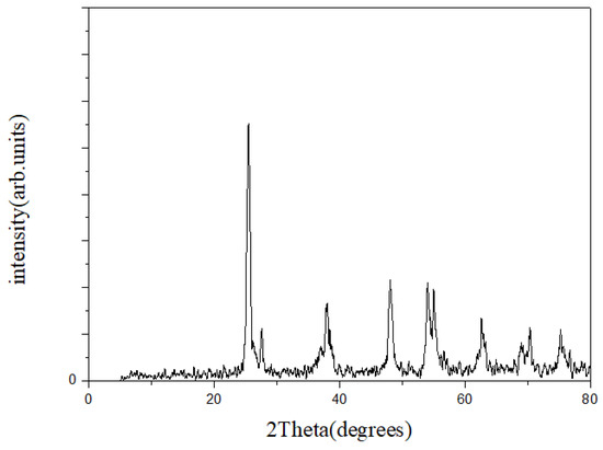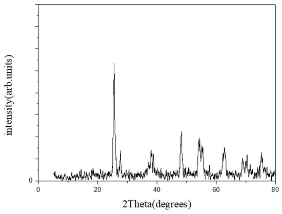 When compared with JCPDS standard chart No. 21-1276, the diffraction peaks of P25 in P25/ZrO2/GO were the same as the peaks of titanium dioxide (anatase), as shown in Figure 10. The peaks at 2θ = 28.2° and 31.4° are the characteristic peaks of a zirconium dioxide monoclinic crystal. The peaks at 2θ = 35.2°, 50.6°, and 60.2° are the characteristic peaks of the zirconium dioxide cubic phase. Since the content of ZrO2 we added was just a small amount, the peaks are not obvious. The peaks at 2θ = 10.9° and 43.53° are the characteristic peaks of graphene oxide, but the peaks are not clearly displayed due to small amounts of graphene oxide in P25/ZrO2/GO.