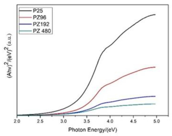 Generally, the energy gap of TiO2 photocatalyst is about 3.2 eV. From Figure 6, the energy gap of P25 is about 3.29 eV based on Kubelka-Munk coordinates. After adding zirconium dioxide, the energy gap tended to decrease.