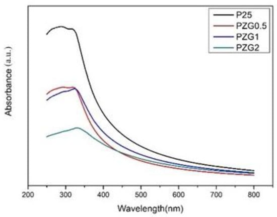 From Figure 12, when GO was added into the P25/ZrO2, the initial absorption wavelength shows a redshift. The more the amount of graphene oxide added, the more the redshift occurs.