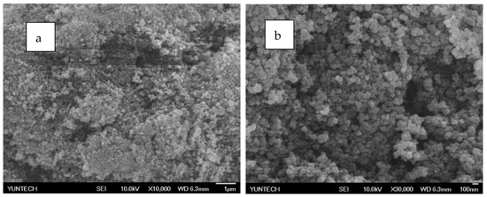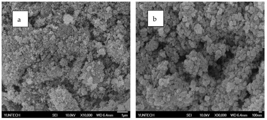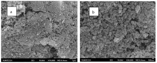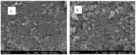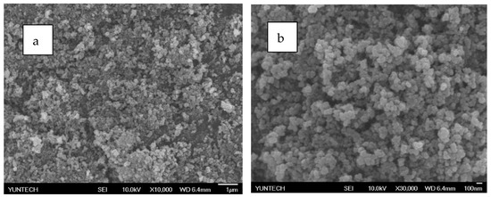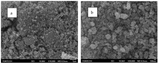 SEM analysis of PZG0.5 by electrospray method: (a) 10,000 times and (b) 30,000 times.