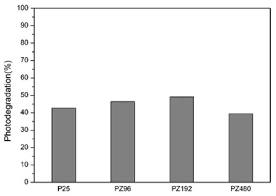 The photodegradation rate of the P25 commercial photocatalyst was 42.63%. After adding zirconium dioxide, the photodegradation rate of the PZ96 photocatalyst was 46.38%, and the photodegradation rate of the PZ192 photocatalyst was 49.23%, as shown in Table 7 and Figure 20. The photodegradability had an upward trend. It can be proved that adding zirconium dioxide can help the photocatalyst attract electrons, reduce the probability of electron–hole recombination, and increase its photodegradation activity [9]. When 480 mg of zirconium dioxide was added, the photodegradation rate of the PZ480 photocatalyst decreased to 39.45%, which was lower than that of P25 commercial photocatalyst. There were two main causes of this. First, the energy gap of zirconium dioxide is about 5 eV. It is especially true that when too much zirconium dioxide is added, the quantum yield of the photocatalyst is reduced [10]. Secondly, adding too much zirconium dioxide may cover the photocatalyst surface excessively, and so this makes it unable to contact with the reactants, thereby resulting in a reduction in the photodegradation reaction [9]. These two factors lead to the decrease of photodegradation rate.