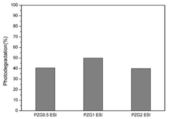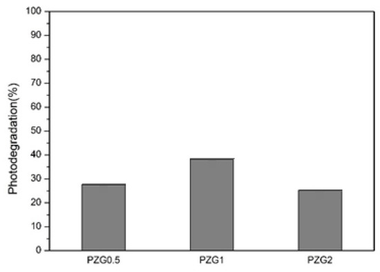 The photodegradation rate of PZG0.5 was 26.61%, the photodegradation rate of PZG1 was 38.35%, and the photodegradation rate of PZG2 was 17.47%, as shown in Table 8 and Figure 21. The photodegradation rates of the three were lower than that of PZ192, which had no content of graphene oxide. Due to the agglomeration of graphene oxide and P25 commercial photocatalyst [11], the particle size increased and the reaction surface area decreased, thereby resulting in a decrease in photodegradability. When graphene oxide was added up to 2%, the photodegradation rate of PZG2 was lower than those of the former two. When graphene oxide is added too much, it tends to produce a barrier on the surface. It becomes over-covered on the photocatalyst surface and is unable to contact with reactant, thereby reducing the photodegradation reaction [6,12].