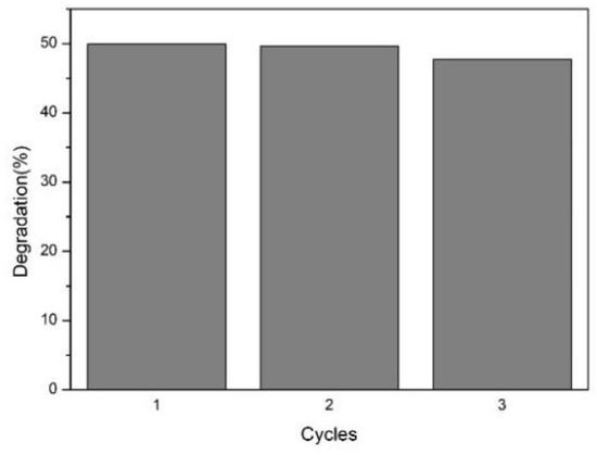 In order to test whether the PZG1 made by the electrospray method can be reused, methylene blue was degraded by the photocatalyst, and then washed with deionized water. The next degradation experiment was carried out under the same conditions. This involved three cyclic tests of photodegradation shown in Figure 23. In the first photodegradation test, the photodegradation rate was 49.92%. After washing the photocatalyst with deionized water, the second test was carried out, and the photodegradation rate was 49.65%. For the third test after ultrasonic washing, the photodegradation rate was 47.71%. The photodegradation rate indicates that the photocatalyst has good stability and reusability. In the cyclic test, the photodegradation rate gradually tended to decrease. This was mainly due to the quality of the photocatalyst losses caused by washing of the photocatalyst in the experiment [14].