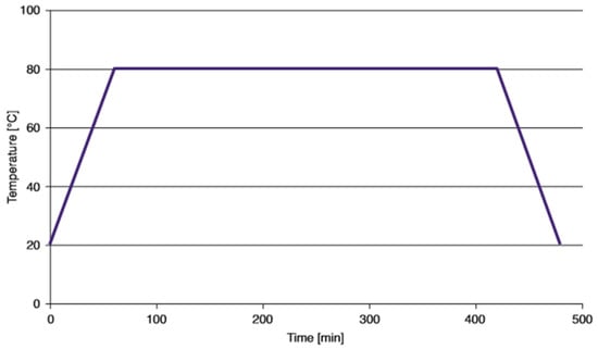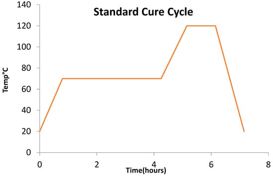 The aluminium skins are aluminium 6082. The main mechanical properties consist of: density (2.71 kg/m3), Young’s modulus (71 GPa), and yield strength (280 MPa). M79 200T2 prepreg was used as the carbon fibre reinforced polymer surface for the sandwich structure. 200T2 is a type of prepreg consisting of a 2 × 2 twill weave pattern. The main properties of the resin matrix, as well as prepreg, are presented in Table 2. These outer skins are HexPly® M79 carbon fibre reinforcement with the twill weave pattern, which is more drappable and is therefore a suitable choice for this type of application. HexPly® M79 is a low temperature cured CFRP system. The curing process takes place at 80 °C in an oven for 8 h. Figure 3 shows the typical cure cycle of CFRP based on the out-of-autoclave (OOA) method. KMS industry [9] described the automobile industry as constantly looking for methods to make vehicles cheaper, lighter, faster, and stronger. Based on these ideals, the potential application environment requires OOA as a more economical and time-efficient method for the automobile industry, rather than the autoclave method. The autoclave method needs a more specialised facility and much more investment to achieve the high-quality curing of the composite, which is not generally accepted for general use by the automobile industry.