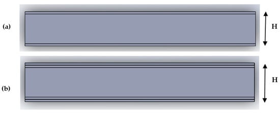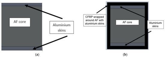 The FE model and simulation conditions can replicate the performance of the aluminium foam with aluminium skins (large scale) subjected to a three-point bending load. The FE model used to simulate the process of the sandwich structure of aluminium foam with aluminium skins wrapped around four layers CFRP by finite elements analysis was developed from two Solidworks® CAD models designed for this simulation, as shown in Figure 14a,b. The FE model of aluminium foam was simplified as a volume without pores, but with the same non-linear behaviour as the actual foam. However, the actual aluminium foam is filled irregularly with pores due to the manufacturing process which can be quite random, and here we have assumed an average. The same thickness of 1 mm of CFRP is applied on all surfaces as shown in Figure 14b.