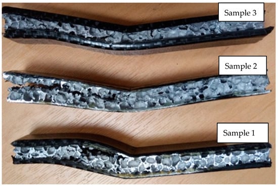 Figure 6 shows the issues of delamination on some of the samples and problems with the core of AFSS with a CFRP skin, which had the main influence on the failure mechanism during the bending test. The damage at the left side of the sample was observed under the bending loading from the top surface, because the connection between the pores of closed-cell AF was at the edges of the porous foam core, the walls collapsed, and the closed-cell foam core showed shear failure prior to the skin cracking or delaminating. There were three samples of the same dimensions and shape. After subjecting them to the bending loads, all of the samples showed signs of the aluminium foam core shearing as shown in Figure 6. This phenomenon needed a solution so that the core could continuously carry the load up to the structure’s failure.