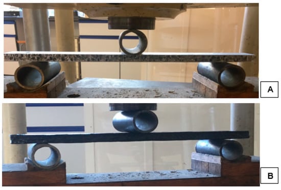 The large scale three-point bending test on (A) closed-cell AFSS and (B) closed-cell AFSS wrapped around four layers of CFRP (XPREG® XC110 3K).
