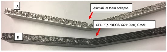 The shape of samples after three-point bending test; (A) closed-cell aluminium foam with aluminium skins; (B) closed-cell aluminium foam with aluminium skins wrapped around four-layers CFRP (XPREG® XC110 3K).