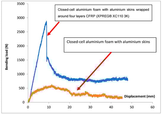 Comparison of the typically three-point bending tests results between closed-cell aluminium foam with aluminium skins and closed-cell aluminium foam with aluminium skins wrapped around four layers CFRP (XPREG® XC110 3K).