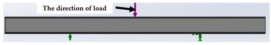 The direction of the load and boundary conditions for the FE model simulation are shown in Figure 15. The positions of the load and constraints were the same as the conditions of the experimental test shown in Section 3.3. The solid geometry set for the FE model includes AF and aluminium skins. The load parameter was derived from the test result and the load applied on an area on the top face of this FE model. The constrains were set at the bottom face of the FE model to simulate a frictionless roller system.