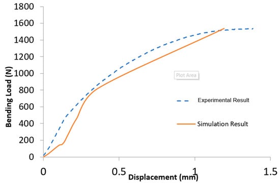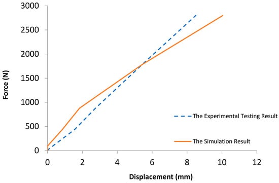 The value of the maximum load was set at 1500 N. The displacement was recorded as 4.6 mm from the experimental test. The reason for the significant difference in displacement between the FE model (wrapped around the CFRP) and the testing sample is the pores filled around the AF core in the actual beam; however, the solid structure was selected for an FE model to simplify it and reduce the calculation time for the simulation results. The failure flexure load of larger AFSS wrapped around CFRP was 2800 N. The same maximum load was applied to the FE model to determine the displacement between the experimental testing sample and FE model. Figure 17 shows that the displacement of the FE model was 10 mm under the 2800 N (peak load obtained by the experimental result) and the testing result is 8.5 mm.