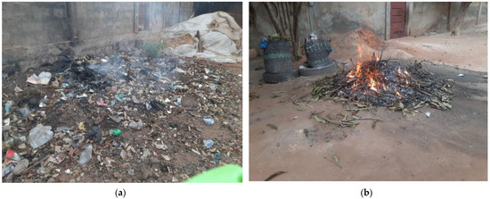 Waste management practices used by citizens in Togo: (a) Example of litter management by local citizens with no access to organized waste disposal; (b) Example of burning waste plastic with organics. Note the plastic waste in the garbage bins about to be burned.