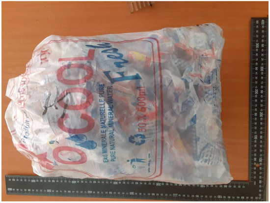 To provide benefit for the local population while valorizing plastic waste, a decentralized waste management solution that not only manages the waste for the community, but furthermore provides economic benefits is needed. A rising solution for plastic waste management is the incorporation of plastic into building material, especially pavement tiles. Most studies that focus on this aspect of plastic waste management have proposed the use of plastic as additive to concrete bricks [29] or asphalt pavement production [30,31], usually requiring the use of sophisticated machinery. It is possible, however, to make a composite using waste plastic as the primary material with waste sand [32]. A more recent study has analyzed the use of plastic waste in pavement blocks in West Africa, but the study in Ghana focused on the use of mixed plastic to produce the pavement blocks [33]. This has the advantage of minimizing pre-processing (which can be considerable [34]) but the disadvantage that the resultant material product has notably inferior mechanical properties from those expected in pure polymers. Composites with better mechanical properties can potentially be obtained if the most commonly used plastics are sorted before pavement production. Plastic bags are a widely used in developing countries, especially in Western Africa [35,36]. In Togo, for example, drinking water sachets are made of low-density polyethylene (LDPE) and the water sachets waste are ubiquitous [37] as shown in Figure 2.