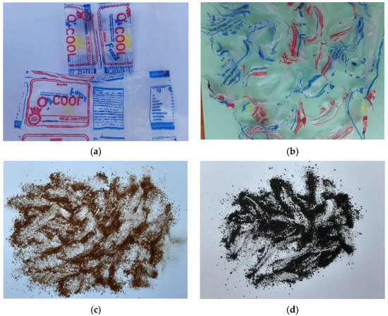 Details of the input material used in manufacturing the pavement. (a) Cleaned LDPE plastic water bag waste. (b) Shredded LDPE plastic water bag waste. (c) Sifted sand. (d) Sifted charcoal.