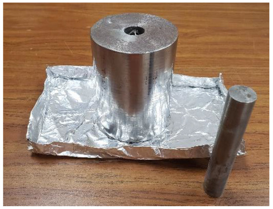 To make compression samples, sample material was cut up into small pellets using cutting pliers. A 1.75 cm diameter die mold (Figure 5) was used to melt plastic pellets together to form cylindrical compression testing samples. The die was placed in the furnace (set to 200 °C) to pre-heat for 30 min. The pellets were then placed into the die and compressed manually using the die insert before heating to increase pellet packing density. The die was again filled to the top and compressed. The die was placed in a muffle furnace at 200 °C for approximately 30 min. The die was removed from the furnace and the material was compressed using the die insert. Some samples required longer (up to 1 h total) to heat. It is assumed that material inconsistencies in the LDPE material caused these inconsistencies since the furnace temperature and all other conditions remained consistent in the testing process. After the material was compressed, it was allowed to sit for approximately 5 min before being manually pushed out of the die. Samples were allowed to fully cool before compression testing. For compression testing, the same 10,000-pound load cell and testing machine used for tensile testing were utilized. A crosshead speed of 2 mm/minute was used. Results are collected for peak stress.