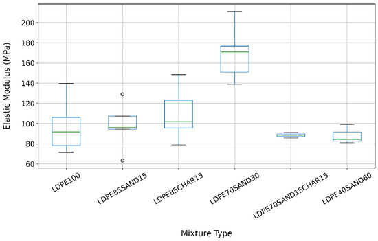 Different pavement tiles textures were obtained depending on the mixture and the weight percentage of each of the raw material, LDPE, charcoal, and sand. Multiple runs of the tensile test were performed for each composite sample and the results including error in a box plot are shown in Figure 7. According to the results, the mixture that offers the best average elastic modulus is the sample containing 70% of LDPE and 30% of sand (169 MPa). The two mixtures with the worst tensile strength are the samples with 40% LDPE 60% sand, and 70% LDPE 15% sand 15% charcoal, respectively. It should be noted that the mixture with 100% LDPE did not perform as well as with the sand composites. On the other hand, the addition of charcoal weakens the mixture regarding elastic modulus, therefore charcoal is not a good option for fabricating new composite pavement tiles with LDPE.
