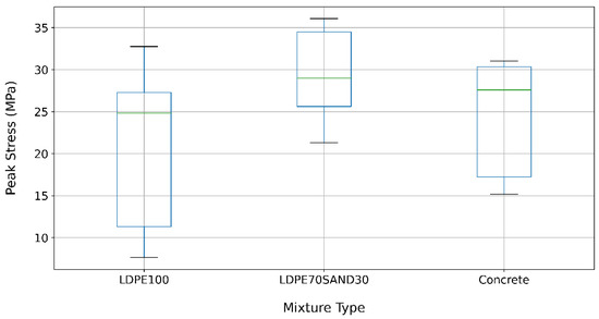 The compression test was performed on the best sample (70% LDPE and 30% sand) from the tensile tests and the results are compared with pure LDPE and concrete (from existing literature [41]). As shown in Figure 8, the sample with 70% LDPE 30% sand has a higher average compressive strength compared to concrete and pure LDPE. The result show that pure LDPE plastic will break more easily under mechanical stress when compared to concrete. When LDPE is combined with sand, however, it increases the strength of the resulting composite, which can sustain more mechanical stress compared to concrete.