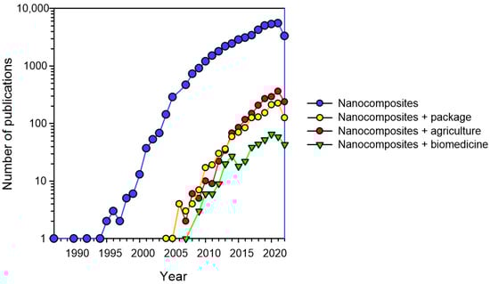 The global market size of nanotechnology in 2002 was about USD 110.6 billion and is predicted to grow to US$ 891.1 billion in the near future [38]. Consumer goods production requires high amounts of nanomaterials, especially in packaging [38]. The biosafe polymers with antibacterial properties may also be applied in modern agriculture and biomedicine. Currently, the amount of publications on “nanocomposites” is more than 44,900, which includes “nanocomposites” + “package” >1800, “nanocomposites” + “agriculture” >1300 and “nanocomposites” + ”biomedicine” >400 (Figure 1).
