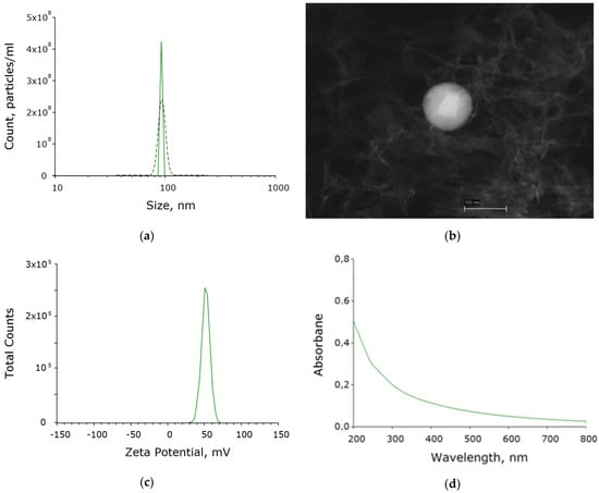 The results of the analysis of the physical characteristics of Al2O3 NPs are shown in Figure 1. The distribution of Al2O3 NPs by the hydrodynamic radius determined on the DLS is unimodal. The mean size of NPs is 92 ± 7 nm (Figure 2a). According to transmission electron microscopy (TEM) data, the average NP size is ~80 nm (Figure 2b). The ζ-potential of Al2O3 NPs in water ranges from +30 to +70 mV, with a maximum of about +50 mV (Figure 2c), which indicates a high stability of the aqueous colloid of NPs. The UV-visible spectrum of NPs has a characteristic appearance for Al2O3 (Figure 2d). According to the data with energy dispersive X-ray spectrometry, aluminum and oxygen atoms are present in the NPs, in the ratio O/Al = 1.3 (Figure 3c), which may indicate the presence of Al2O3 and partially unoxidized Al in the NPs.