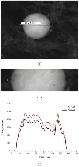 Elemental analysis of Al2O3 NPs: (a) TEM image of Al2O3 NP, analysis section is indicated with line 1; (b) Enlarged measurement site; (c) Nanoparticle profile by Al Kα1 and O Kα1.