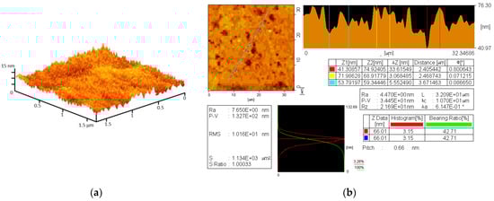 According to the results of atomic force microscopy (AFM), the nanocomposite has a smooth surface without defects and roughness (Figure 4a). Unfortunately, the AFM method does not allow for the evaluation of the distribution of NPs inside the polymer matrix. The optical properties (in particular the refractive index) of PLGA and Al2O3 significantly differ, so the distribution of Al2O3 NPs in the polymer thickness can be established with modulation interference microscopy (MIM) (Figure 5).