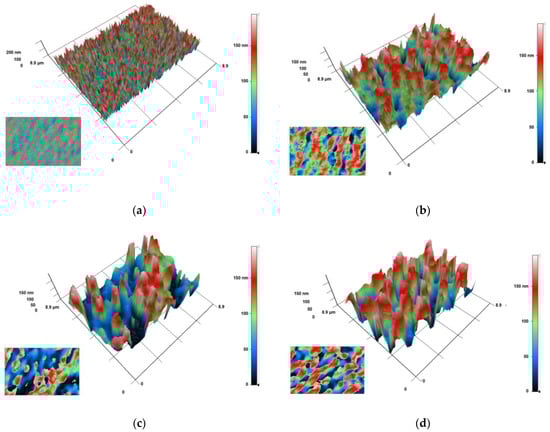 Images were obtained using a modulation interference microscope: (a) Polymer without NPs (b) and polymers with Al2O3 NPs at a concentration of 0.001%; (c) At a concentration of 0.01%; (d) At a concentration of 0.1%. Three-dimensional reconstructions of sample surfaces are presented. The X and Y axes show the actual size of the studied surfaces in micrometers. The Z-axis shows the surface relief as a phase change expressed in nm. Top view (surface elevation map) is shown in the lower left corner of each figure.