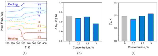 Results of thermal analysis and differential scanning calorimetry of nanocomposites: (a) Thermograms obtained in heating and cooling mode; (b) Glass transition temperatures of samples; (c) Change in the heat capacity.