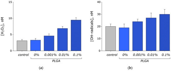As mentioned earlier, generation of ROS is a more described mechanism of the antibacterial action of metal oxide NPs. The ability of the synthesized nanocomposite to generate key ROS: H2O2 (Figure 6a) and OH-radicals (Figure 6b)—was evaluated. Hydrogen peroxide is the most stable and long-lived ROS. OH-radicals are the most reactive ROS [80]. PLGA without dopant did not change the generation of both studied ROS. The addition of Al2O3 NPs impact on the generation of hydrogen peroxide (Figure 7a) and OH radicals (Figure 7b). It is essential that the effect depends on the Al2O3 NPs concentration.