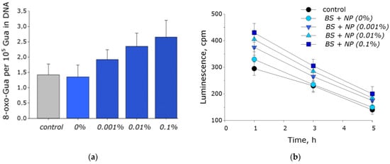 Effect of composite material containing PLGA and Al2O3 NPs on the biomacromolecules damage formation: (a) Generation of 8-oxo-Gua in DNA in vitro (2 h, 45 °C); (b) Generation and dynamics of decomposition of LRPS (2 h, 40 °C); Data are presented as mean values and standard errors of mean.