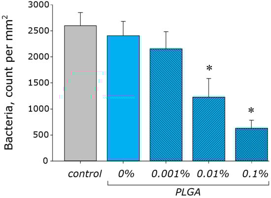 Influence of composite material based on PLGA and Al2O3 NPs on the growth and development of E. coli. *—significant difference at 5% level in comparison with the control (p < 0.05).