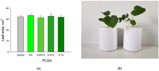 No effect of the nanocomposite on the rate of plant growth and development was observed when cultivating plants in close proximity to rods coated with a nanocomposite based on PLGA and Al2O3 NPs 0.001–0.1% (Figure 10). The area of the leaves was comparable to the control. The size of the leaves does not always reflect the functional state of a plant. Functional parameters of the photosynthetic apparatus, for example, kinetics of chlorophyll a fluorescence, may be more informative [112]. Evaluation of the effect of nanocomposites on the physiological state of plants may be the goal of further research in this field.