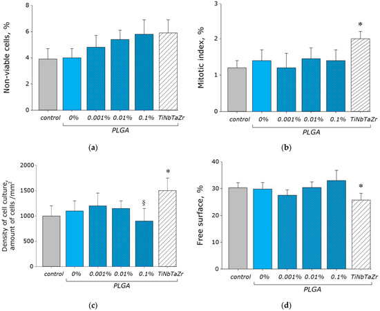 Effect of nanocomposite based on PLGA and Al2O3 NPs on the main characteristics of growth and development of mammalian cell culture: (a) Influence of nanocomposite on the viability of cell culture; (b) Influence of nanocomposite on the mitotic index; (c) Influence of nanocomposite on the cell culture density; (d) Influence of nanocomposite on the colonization rate of free surface by cells. *—indicates a significant difference in comparison with the control (p < 0.05). §—indicates a significant difference in comparison with the TiNbTaZr group (p < 0.05). Data are presented as mean values and standard errors of mean.